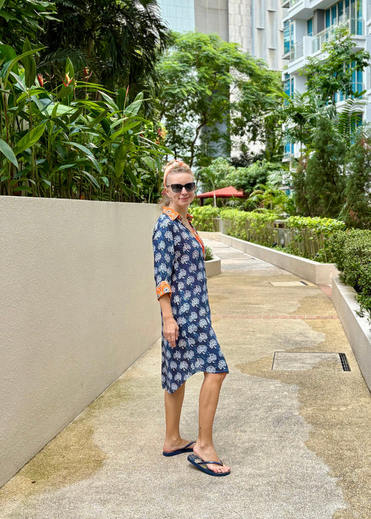 Amalfi Cotton Shirt Dress Blue Brown Palm Trees