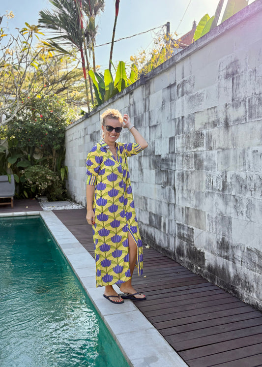 Amalfi Cotton Shirt Dress Maxi Yellow Purple Lotus
